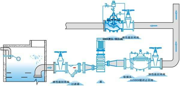 500X泄压/持压阀由主阀、泄压/持压导阀针阀、球阀、微形过滤器和压力表组成水力控制接管系统。利用水力自动操作,即可以作泄压阀用又可作持压阀用。作泄压阀用时,可维持供水路压力在设定的安全值之下;做持压阀用,可维持主阀上游水压在设定值之上,保持主阀上游供水压力。