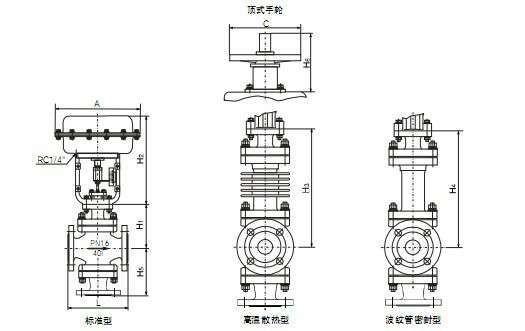 上阀盖 | 标准型-17~+230℃、散热型+230~+450℃、波纹管密封型-40~+350℃ |